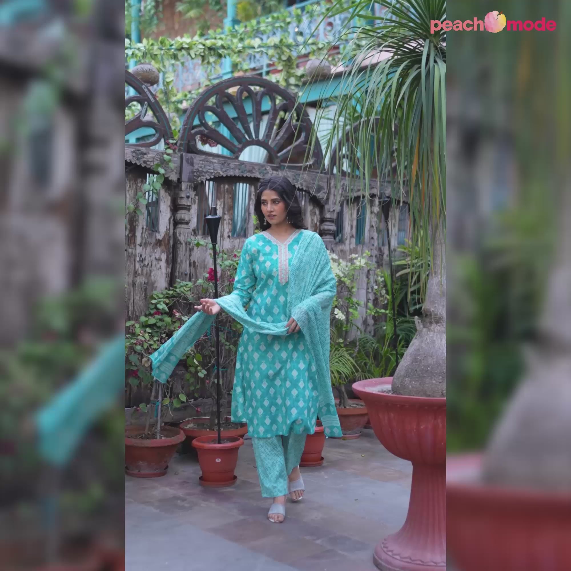 Turquoise Printed Pure Cotton Salwar Suit With Handcrafted