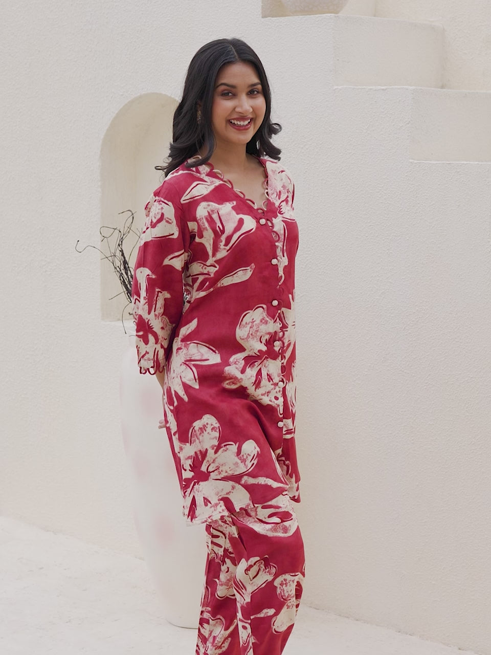 Cherry Red Rayon Co-Ord Set with Straight Cut and Feminine Floral Designs