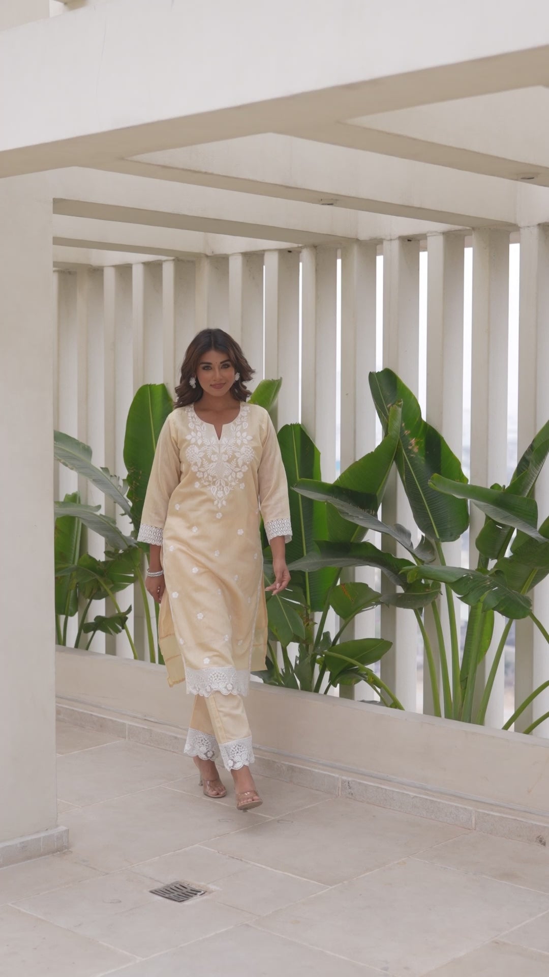 Chikoo colored kurti set is prettified with floral embroidered work as shown which makes it appear classy. This top is made of chanderi fabric which is accompanied with chanderi pant. Women can buy this set to wear for their festive and functions, outing and other.
