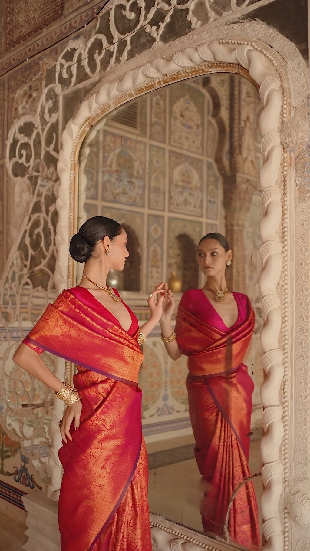 - Premium Fabric: Crafted from Banarasi silk fabric, offering a regal texture and graceful drape.