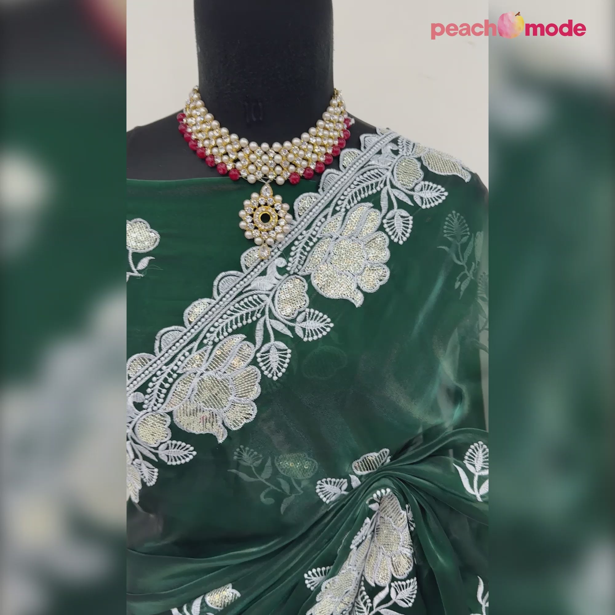 Green Floral Embroidered Satin Saree