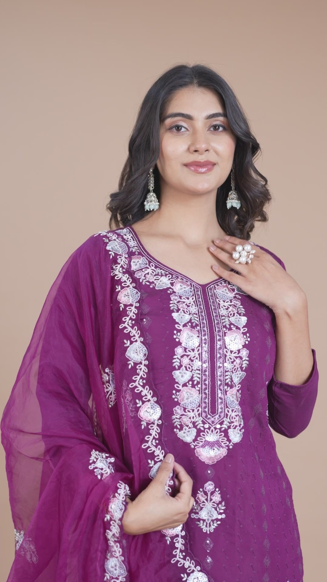 Imperial Purple colored suit is prettified with floral embroidered work as shown which makes it appear classy. This top is crafted from cotton Silk fabric which is accompanied with santoon bottom and organza dupatta. Women can buy this suit to wear for their festive and functions.
