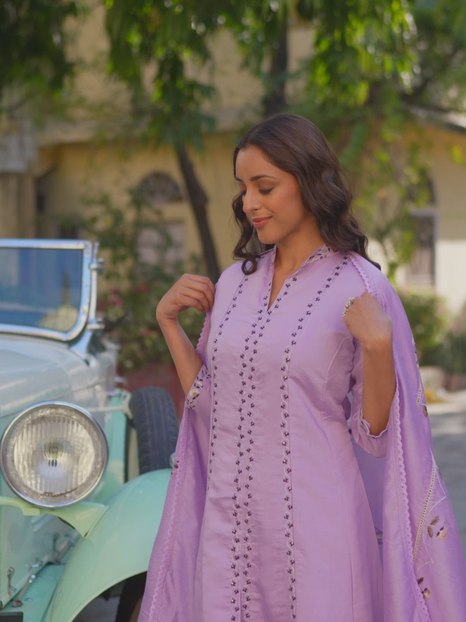 Light Purple Floral Embroidered Chanderi A-Line Salwar Suit