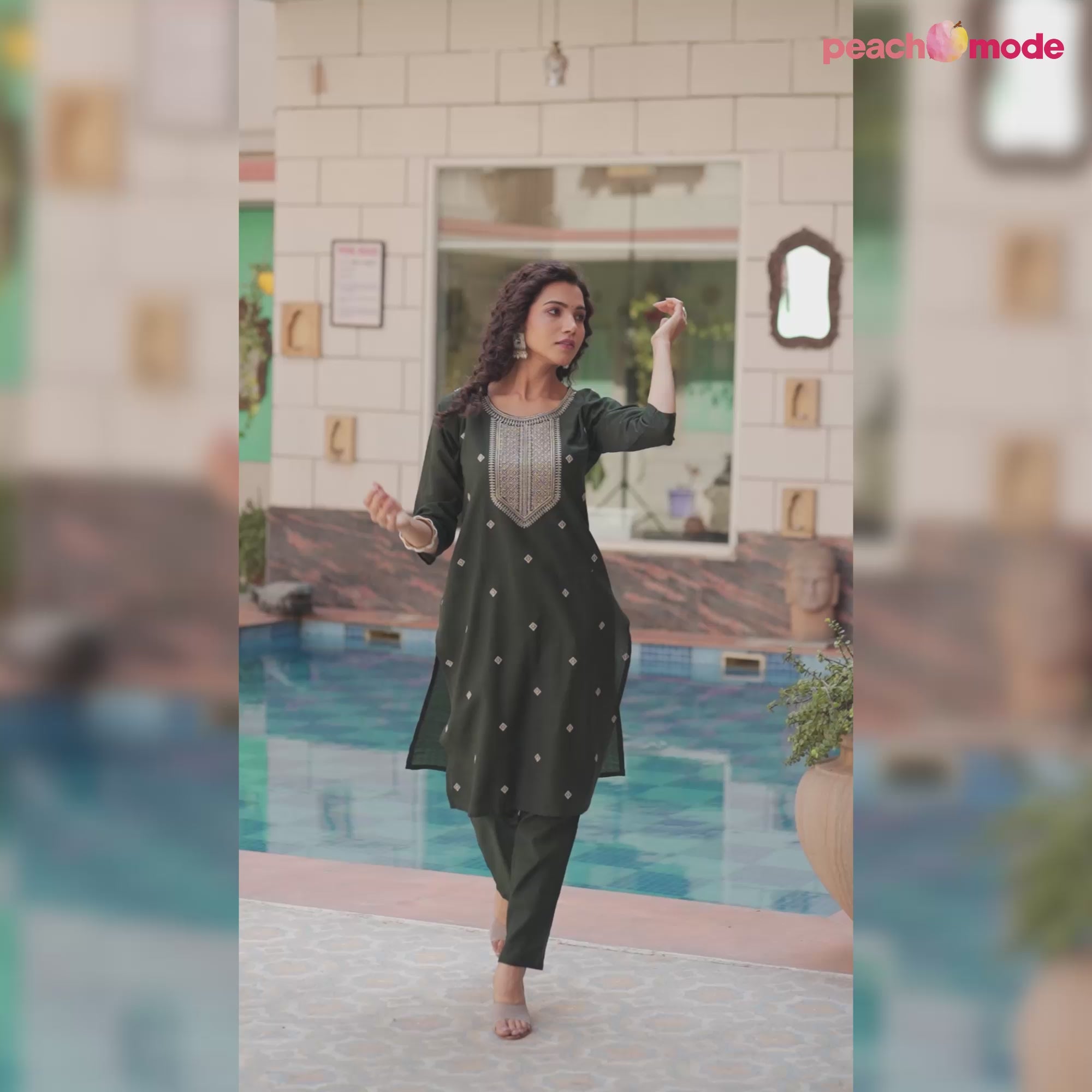 Olive Green Embroidered Viscose Straight Kurti Sets