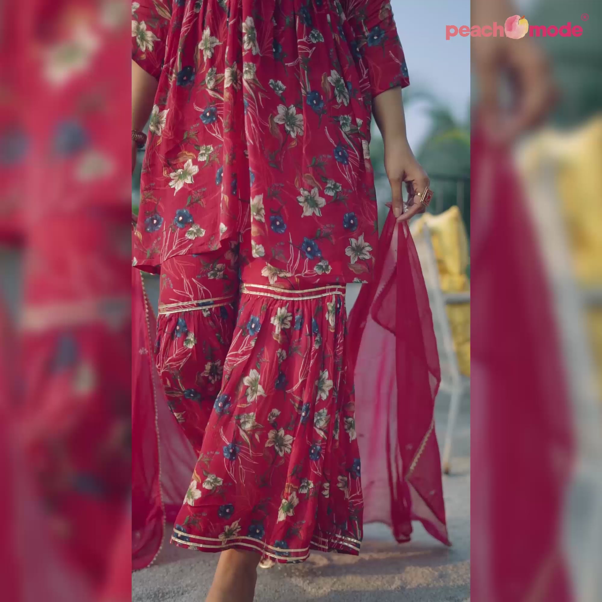 Pink Chinon Floral Printed Alia Cut Sharara Suit With Beads Handcraft