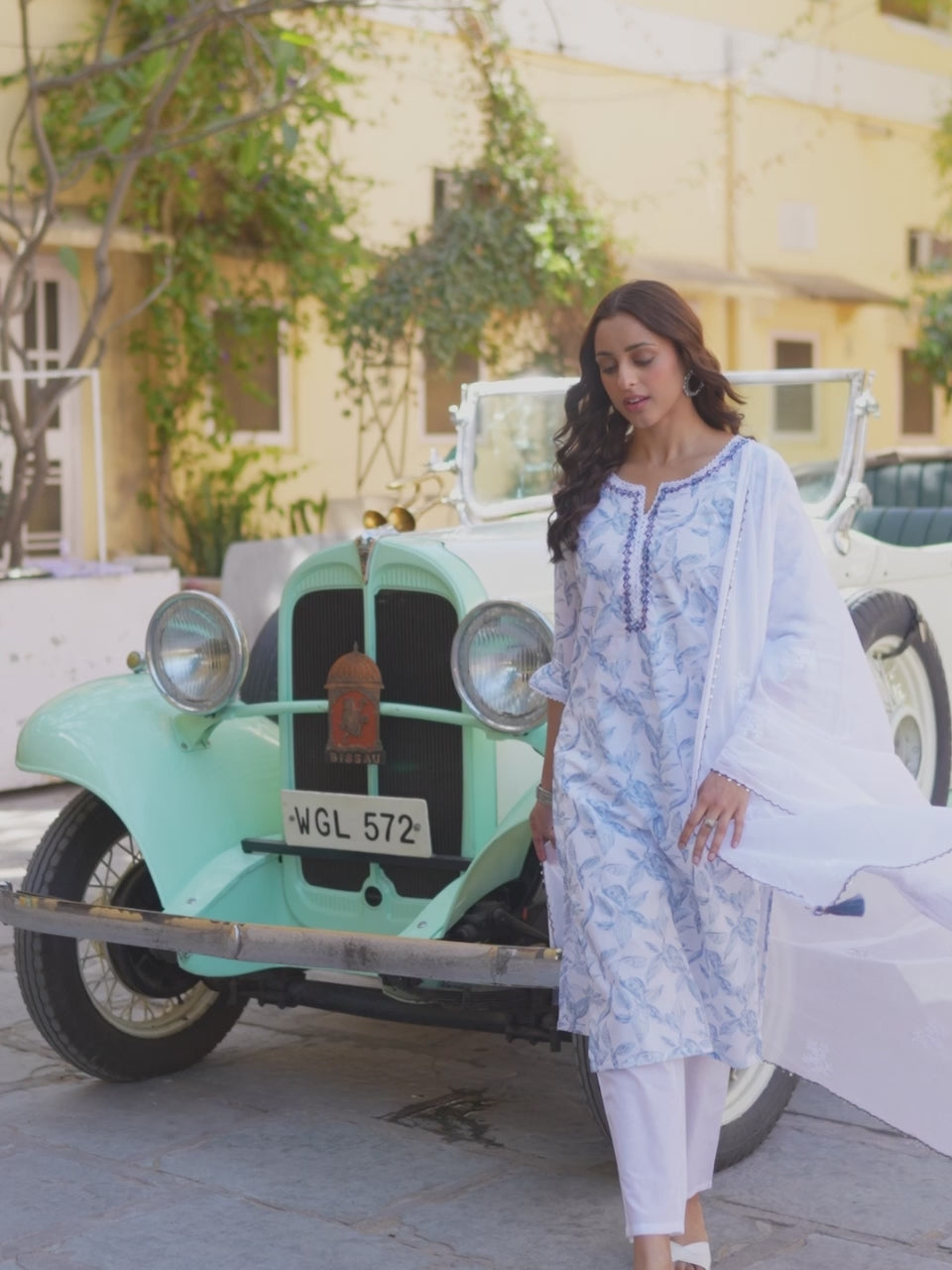 White & blue colored suit set is prettified with floral printed work as shown which makes it appear classy. This top is made of pure cotton fabric which is accompanied with pure cotton bottom with pure cotton dupatta. Women can buy this set to wear for their festive and function.
