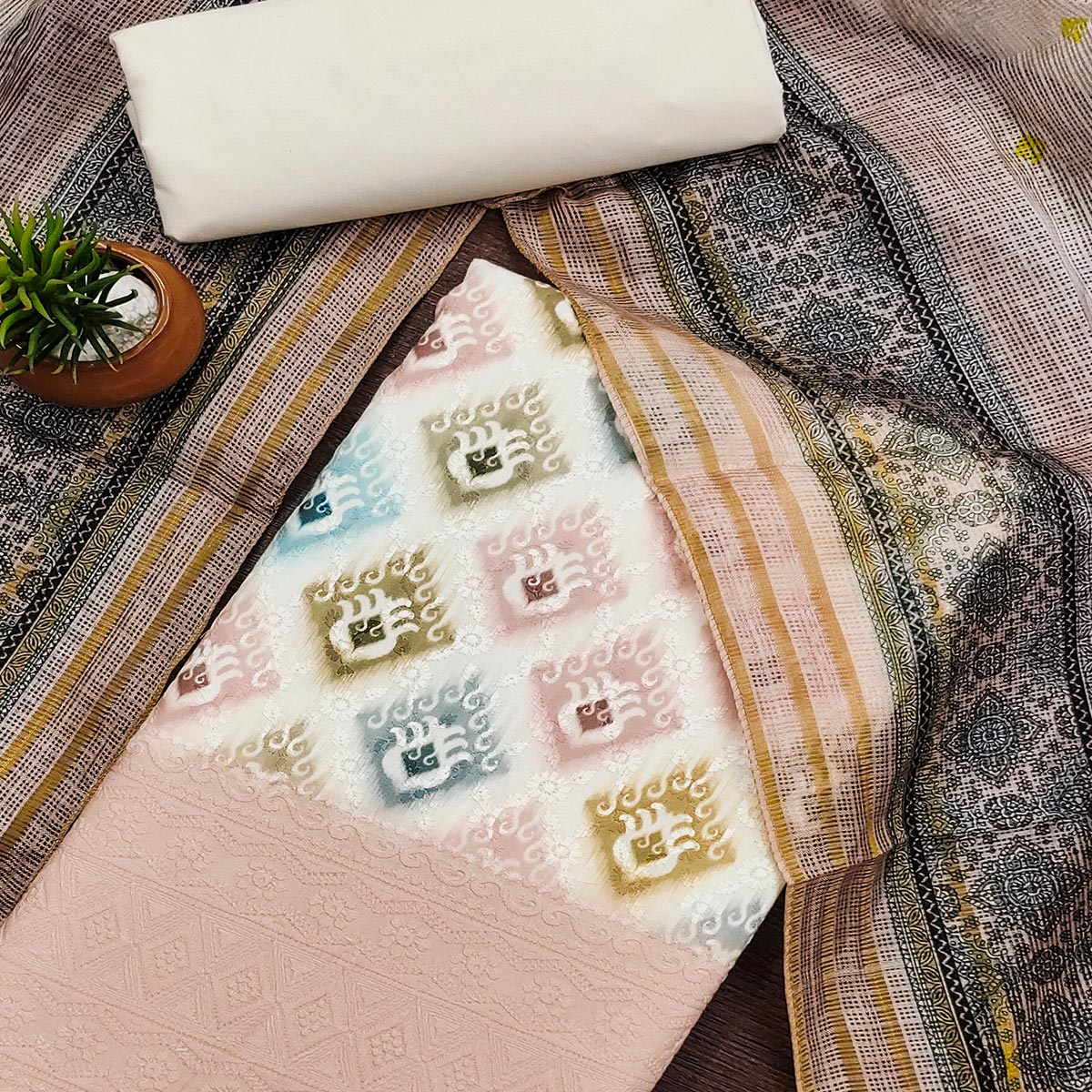 White & Pale Dusty Peach Dress Material In Cotton Blend With Delicate Digital Print & Sifli Embroidery Work