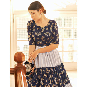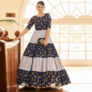 Navy Blue & Grey Partywear Metallic Foil Work Georgette Gown - PeachmodeNavy Blue & Grey Partywear Metallic Foil Work Georgette Gown - Peachmode