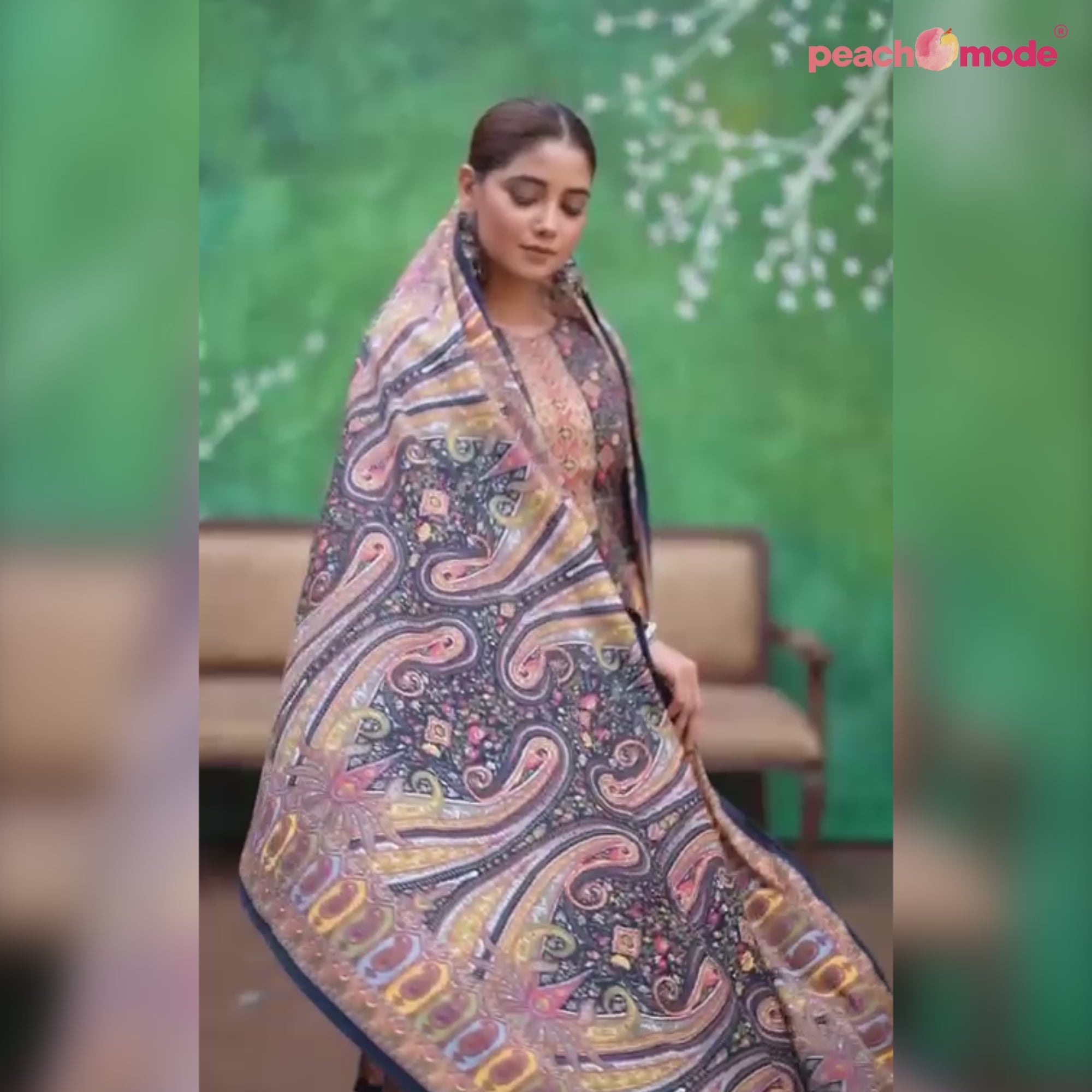 Black colored suit is prettified with floral printed & swarovski work as shown which makes it appear classy. This top is made of pashmina fabric which is accompanied with pashmina bottom and printed pashmina shwal dupatta. Women can buy this suit to wear for their casual, daily and office wear. Note:- The actual product may differ slightly in color and design from the one illustrated in the images when compared with computer or mobile screen.