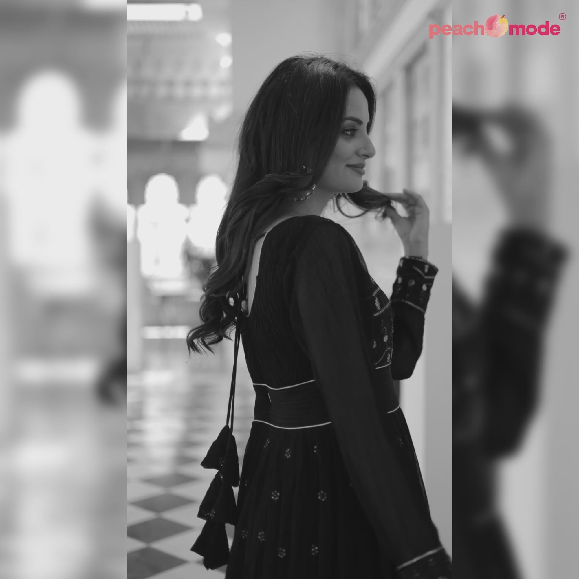 Black colored gown is made from georgette fabric which is highlighted with beautiful thread and sequins work. This gown comes along with crepe lining. Women can buy this gown to wear for their parties, functions and events.