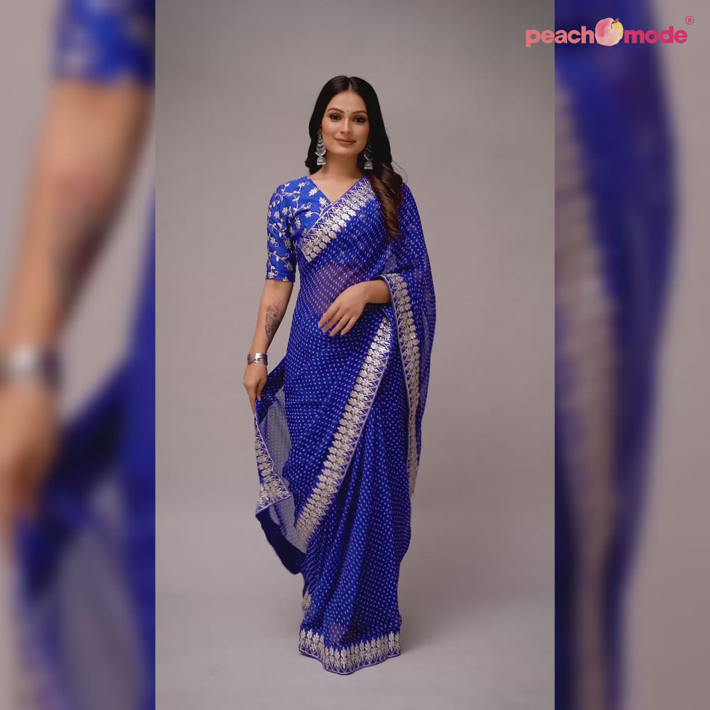 Blue colored saree is made from georgette fabric which is highlighted with beautiful bandhani print and embroidered lace work as shown. comes along unstitched embroidered banglori silk blouse piece which you can customise as per your design/style. Occasion - You can wear this saree for festivals and functions. Note:- The actual product may differ slightly in color and design from the one illustrated in the images when compared with computer or mobile screen.