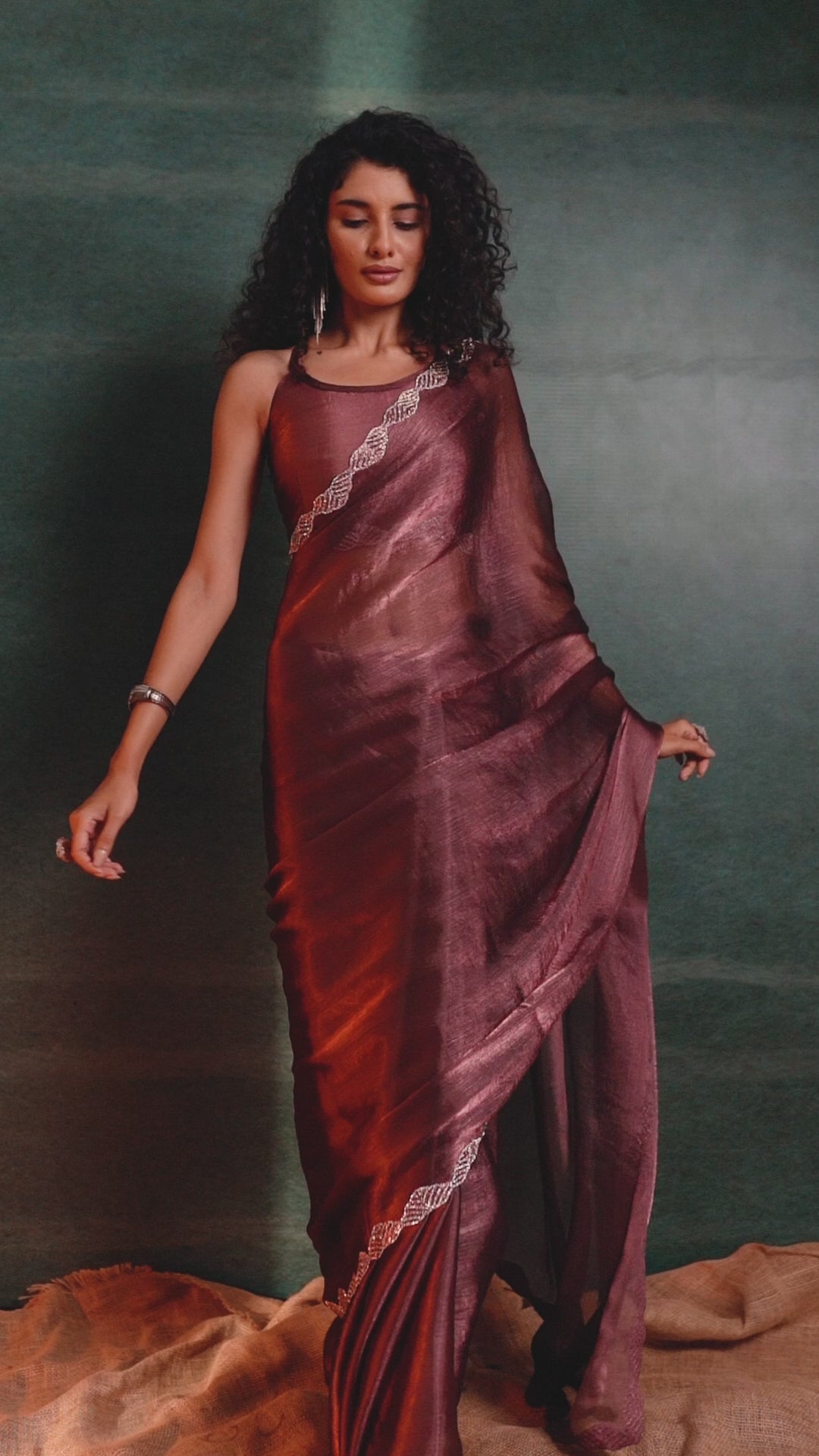Burgundy Solid Tissue Chiffon Saree Accentuated With A Sparkling Zarkan Work Border