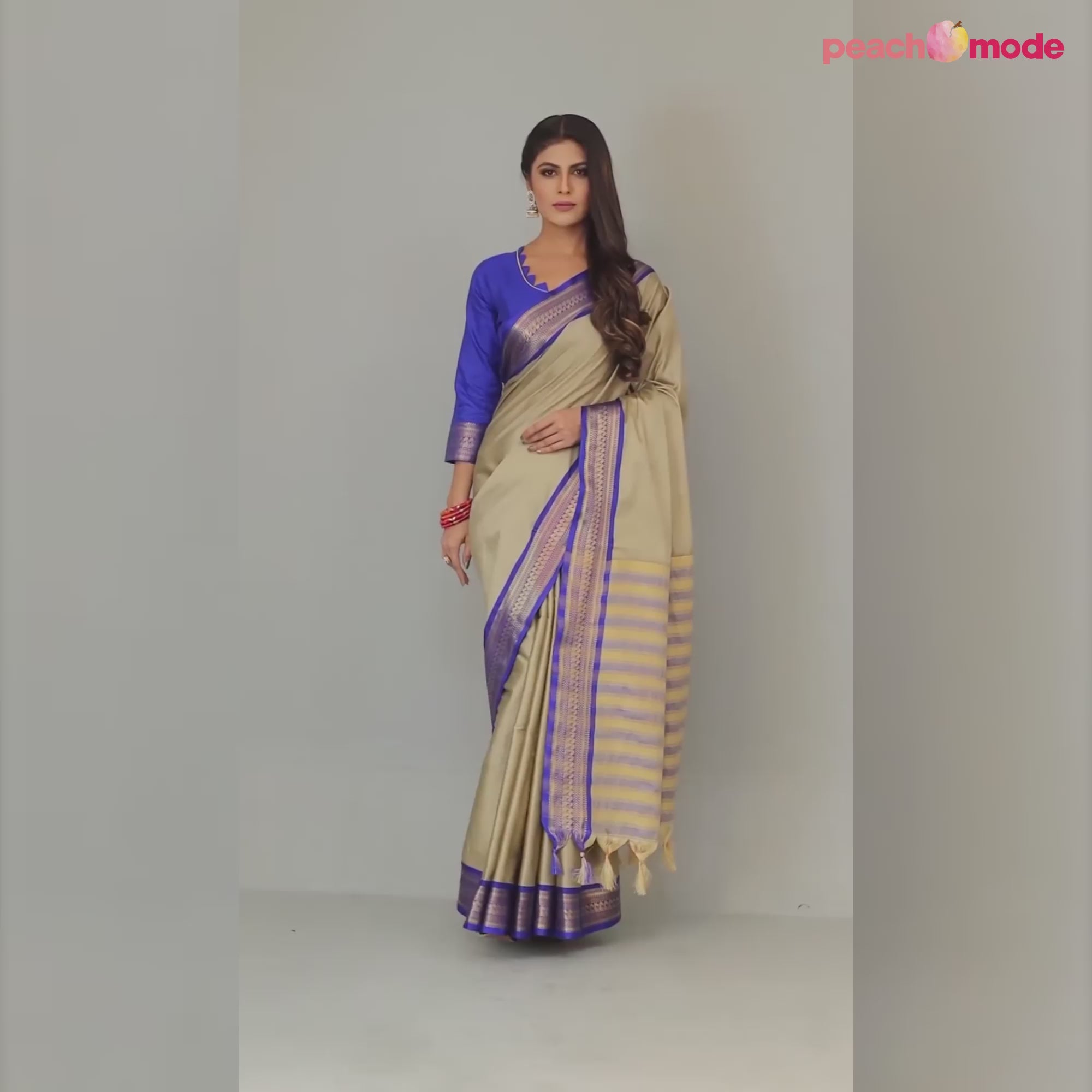 Chikoo & Blue Solid Cotton Silk Saree With Jacquard Border
