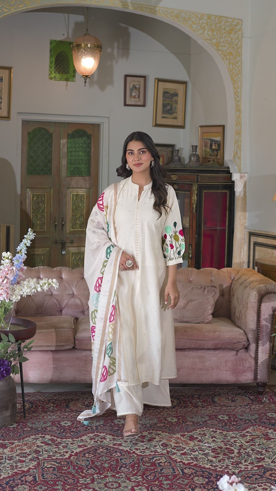 Cream colored suit is prettified with thread embroidery work as shown which makes it appear classy. This top is made of chanderi fabric which is accompanied with chanderi bottom and chanderi dupatta. Women can buy this suit to wear for their festive and functions.