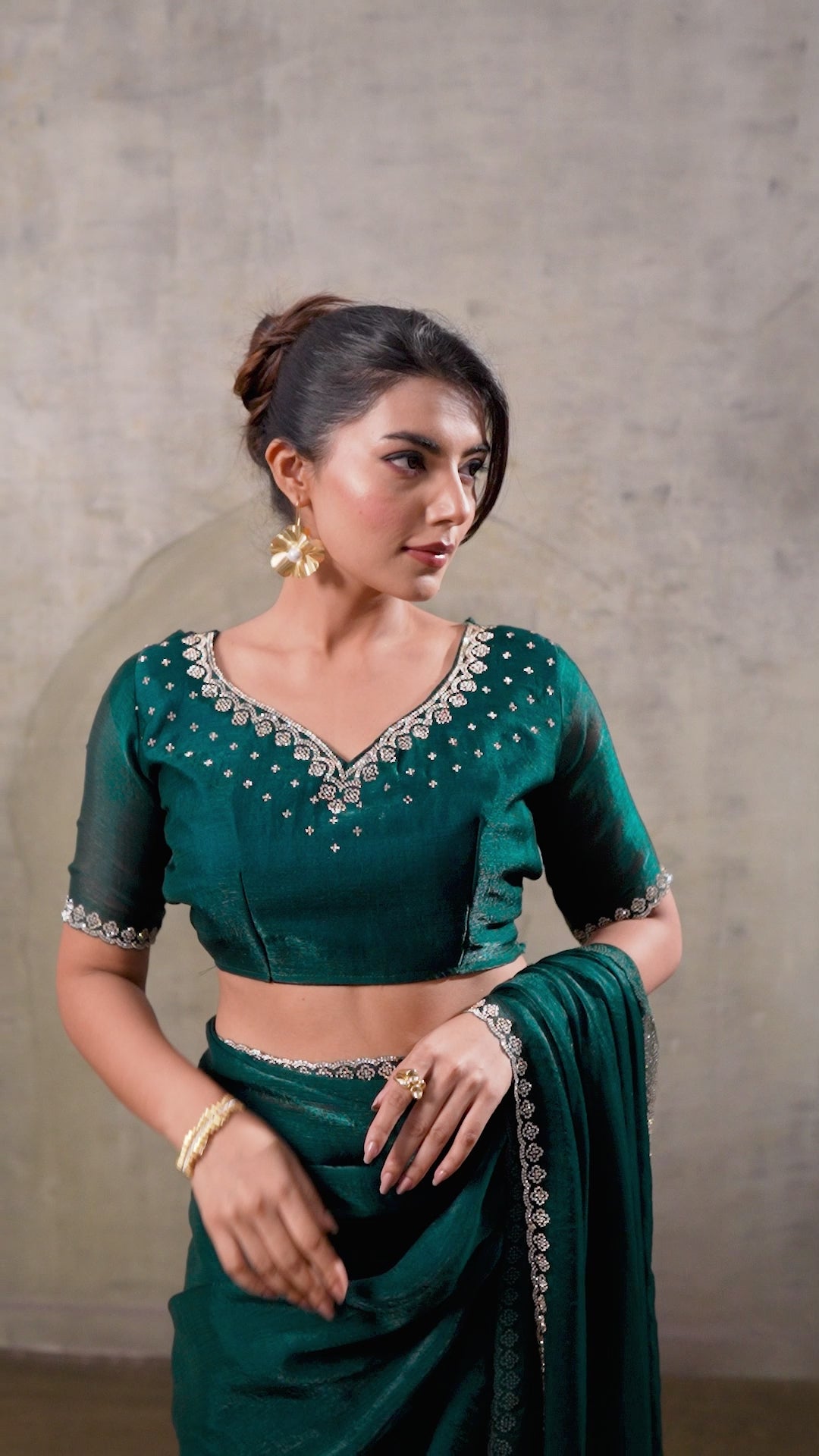 - Chic Elegance: Embrace timeless grace with this green color saree, enhanced by its elegant solid hue and beautifully detailed with shimmering zarkan border work and a stylish latkan pallu that blends tradition with modern sophistication.