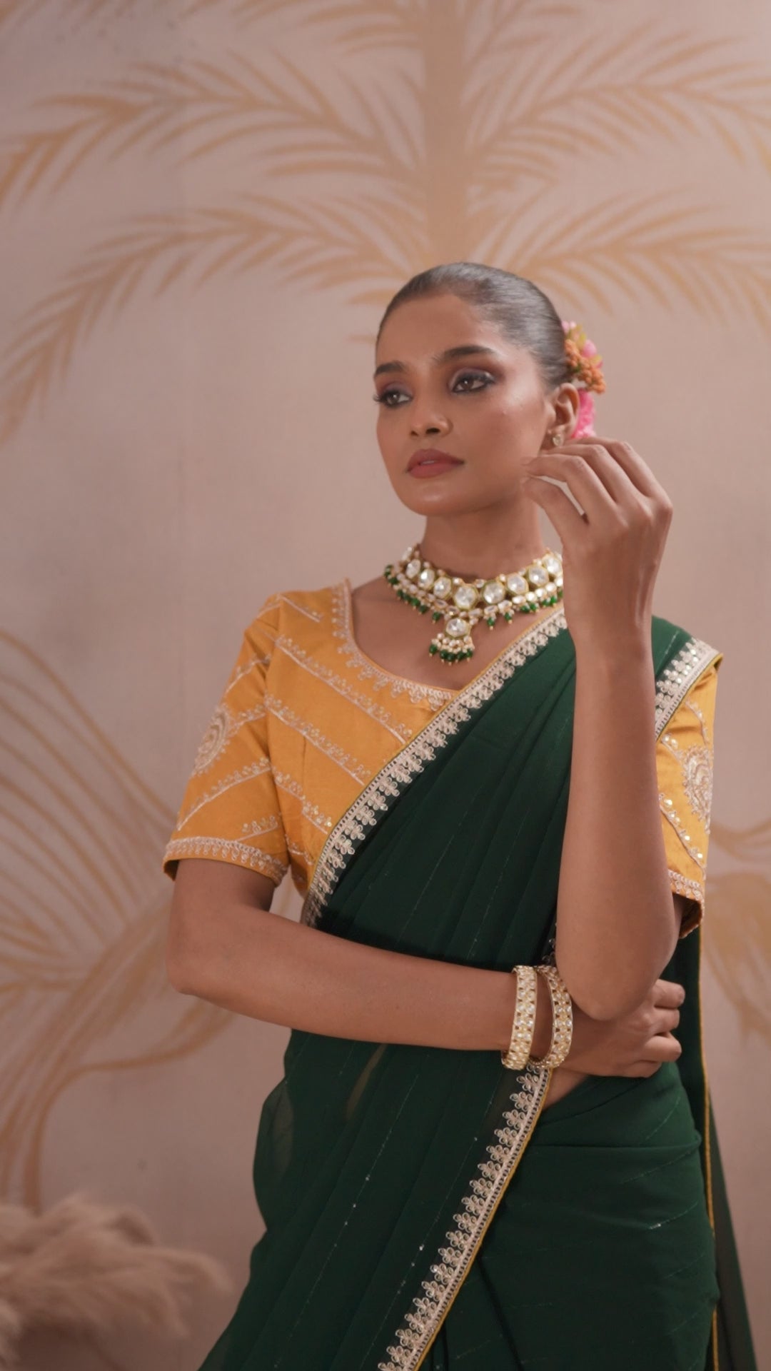 - Chic Elegance: Drape yourself in timeless charm with this green color saree, exquisitely embellished with zari and sequins embroidery, paired with a stylish tassel pallu for a perfect fusion of tradition and modern sophistication.