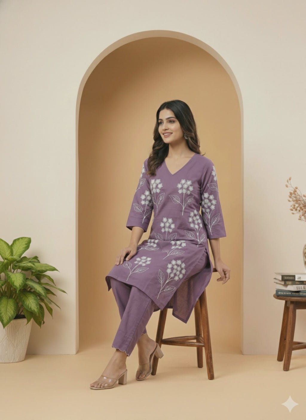 Embrace effortless elegance with our Lavender Floral Embroidered Pure Cotton Kurta and Straight Pant Set. This charming ensemble is perfect for adding a touch of sophistication to your everyday style. The kurta features delicate floral embroidery, a flattering V-neckline, and a comfortable A-line silhouette. The 3/4th sleeves and side slits add to the comfort and ease of movement.
