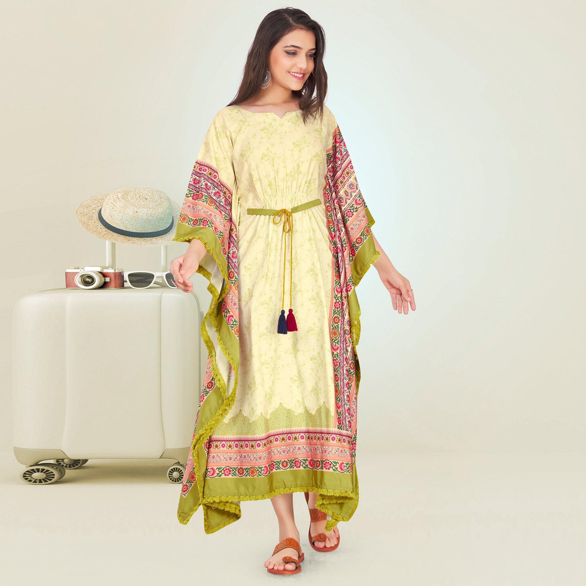 Include yourself in a glamour of a season with this Light Green colored floral digital printed modal kaftan kurti. This kaftan kurti fabric is lightweight and assures the wearer a perfect fit & comfort. This stitched kaftan kurti beautified with floral Digital printed work with latest trend & fashion as shown. Ideal for casual, kitty parties, outing & weekend get together. Pair it up with heels & stylish accessories. This attractive kaftan will surely fetch you compliments for your rich sense of style. Note:- The actual product may differ slightly in color and design from the one illustrated in the images when compared with computer or mobile screen.