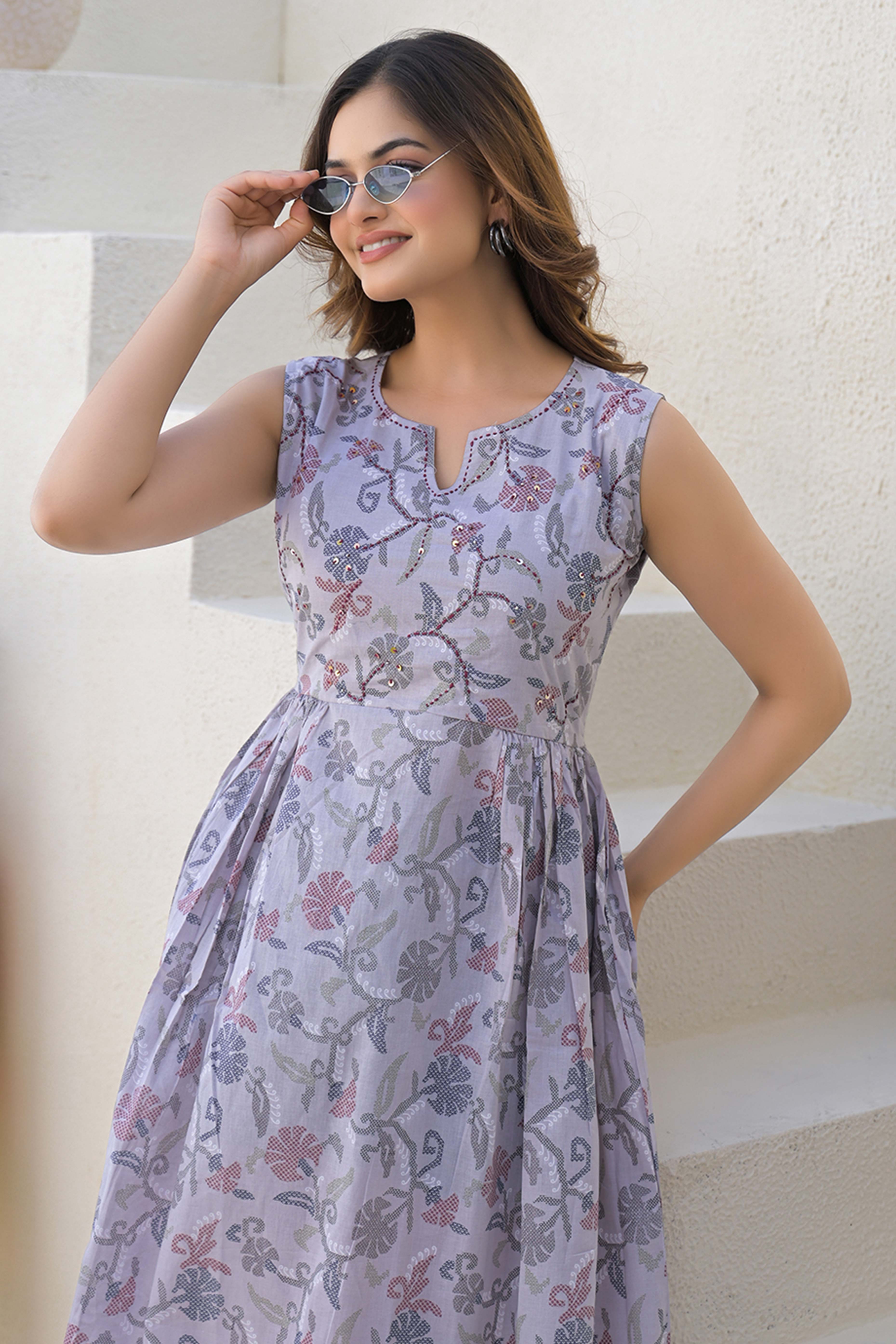 Light Grey Cotton A-Line Dress with Hand Embroidered Florals