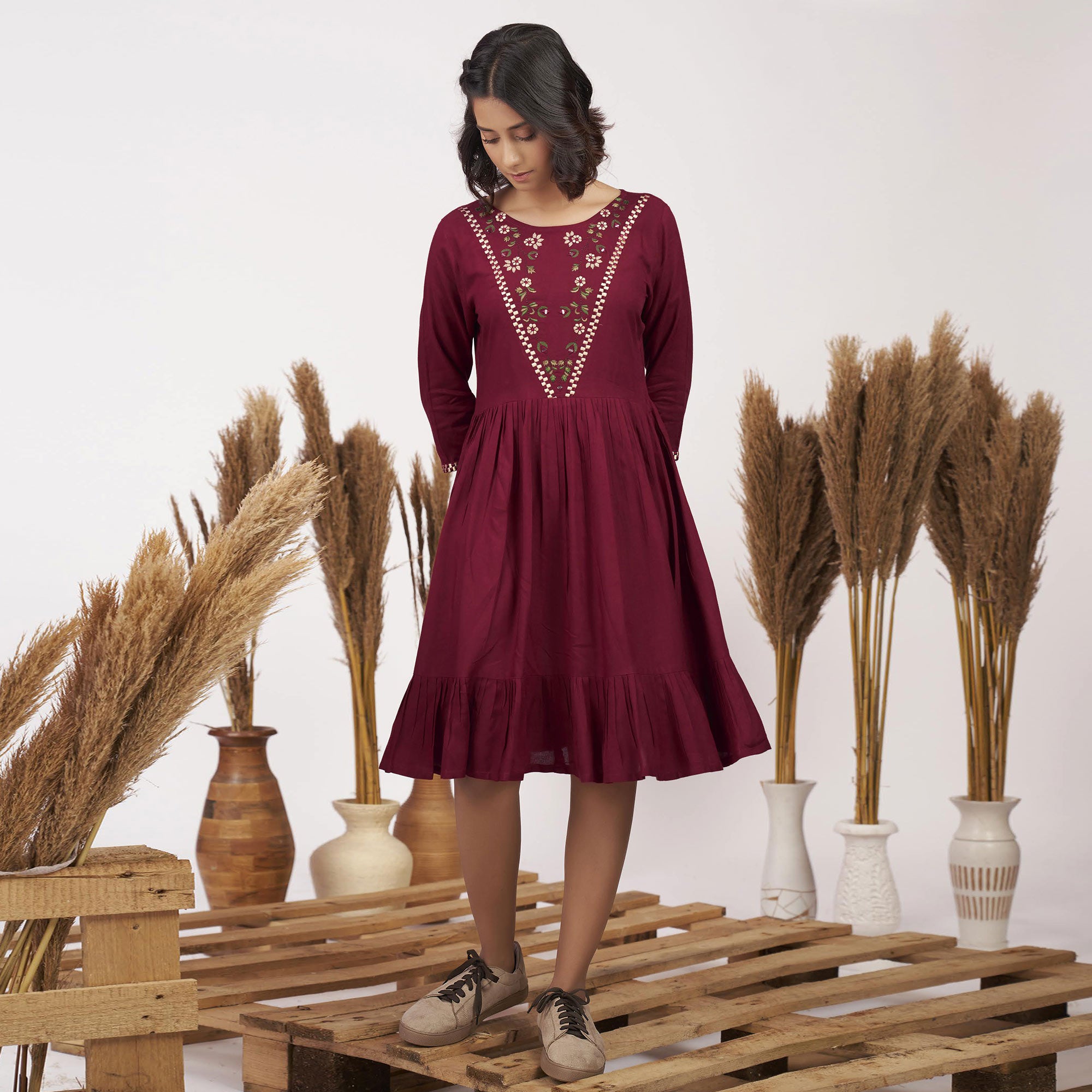 Maroon colored short dress is fashioned on rayon fabric which is lightweight and assures the wearer a perfect fit & comfort. This stitched short dress is beautified with embroidered with mirror work as shown. Ideal for office, casual, daily, outing & weekend get together.