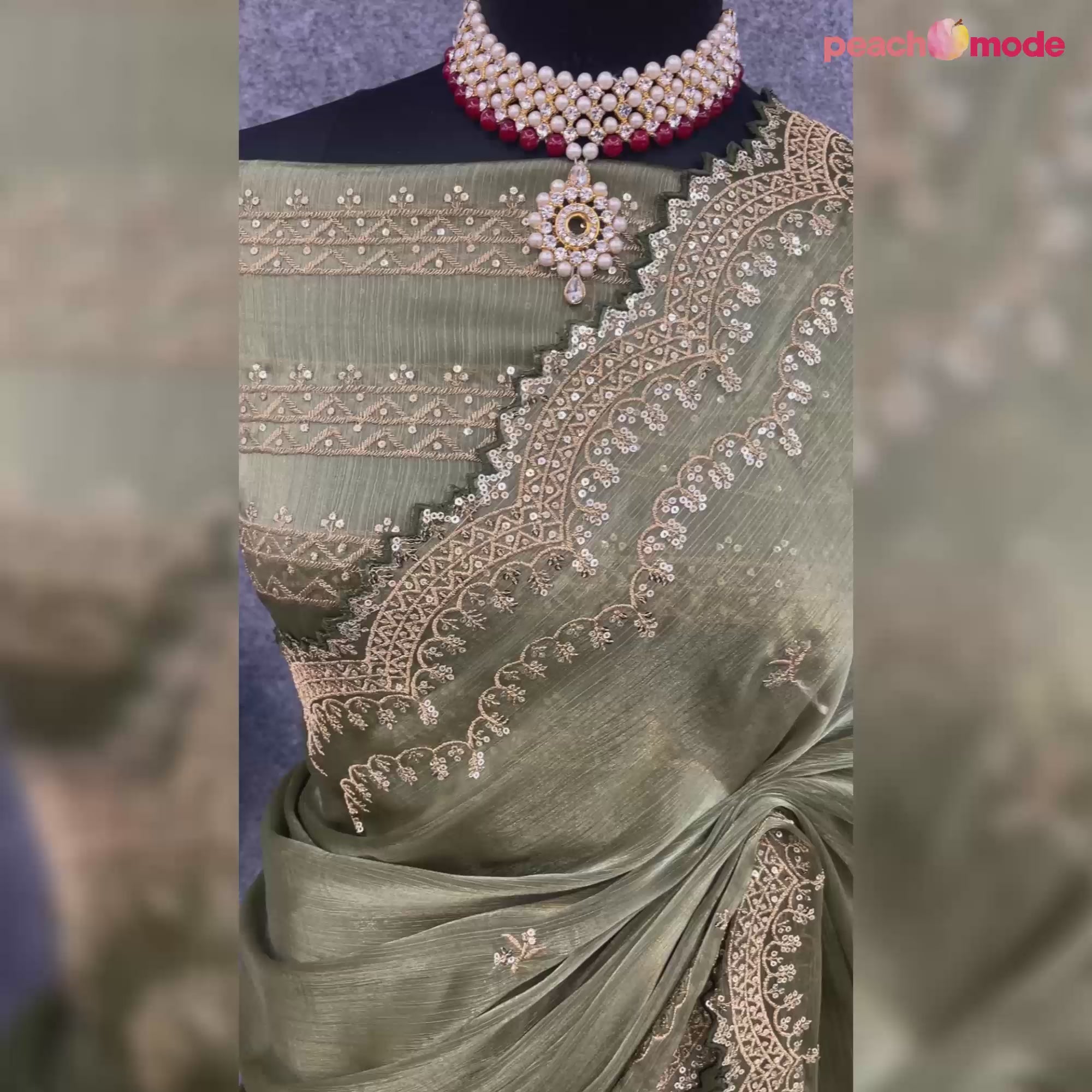 Olive Green colored saree is made from chiffon fabric which is highlighted with beautiful embroidered work as shown. comes along unstitched organza blouse piece which you can customise as per your design/style. Occasion - You can wear this saree for party, festive and functions.