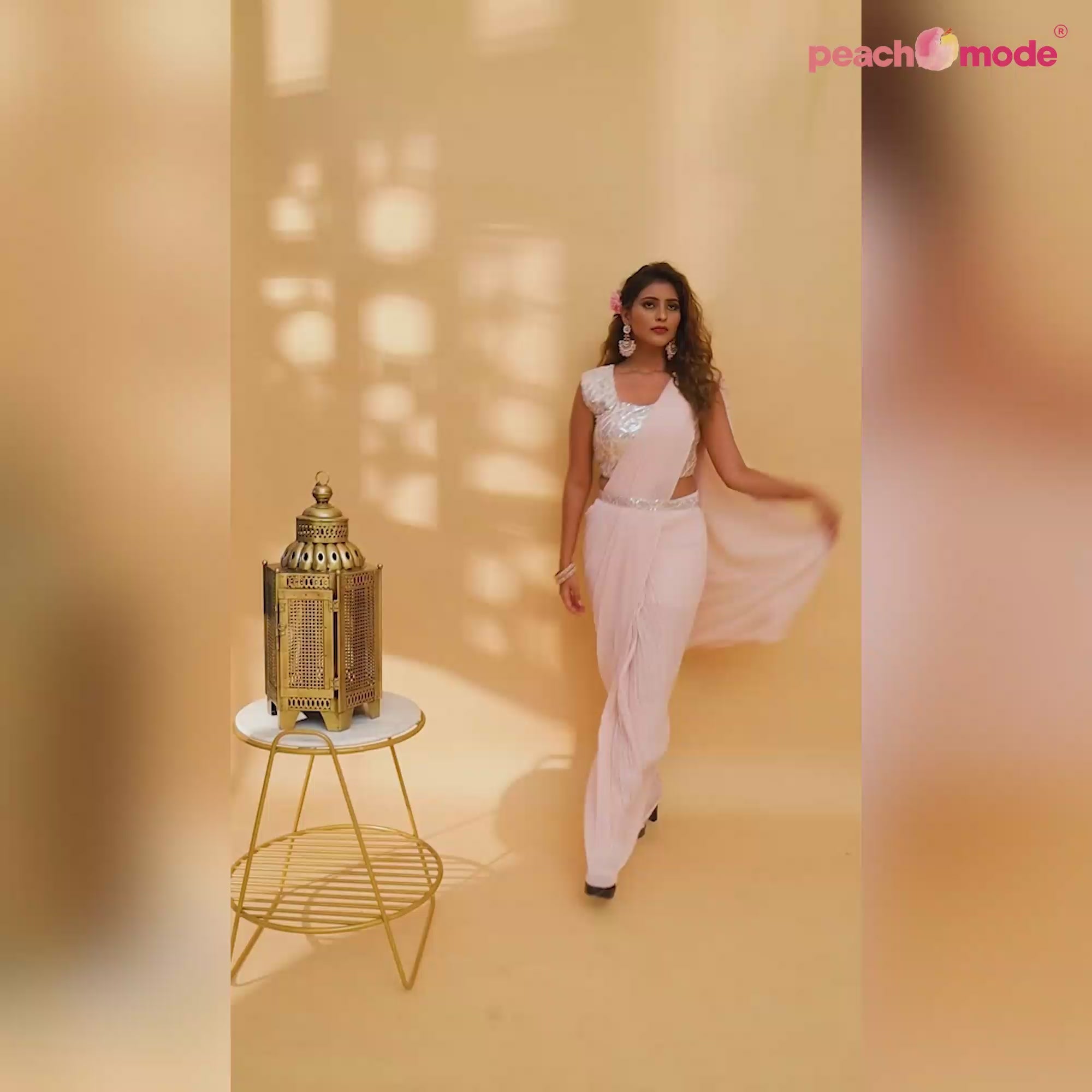 Peach colored stitched saree is made from crush georgette fabric which is highlighted with beautiful sequins embroidered work as shown. comes along with stitched crush georgette blouse with belt which you can customise as per your design/style. Occasion - You can wear this saree for parties, functions and events.