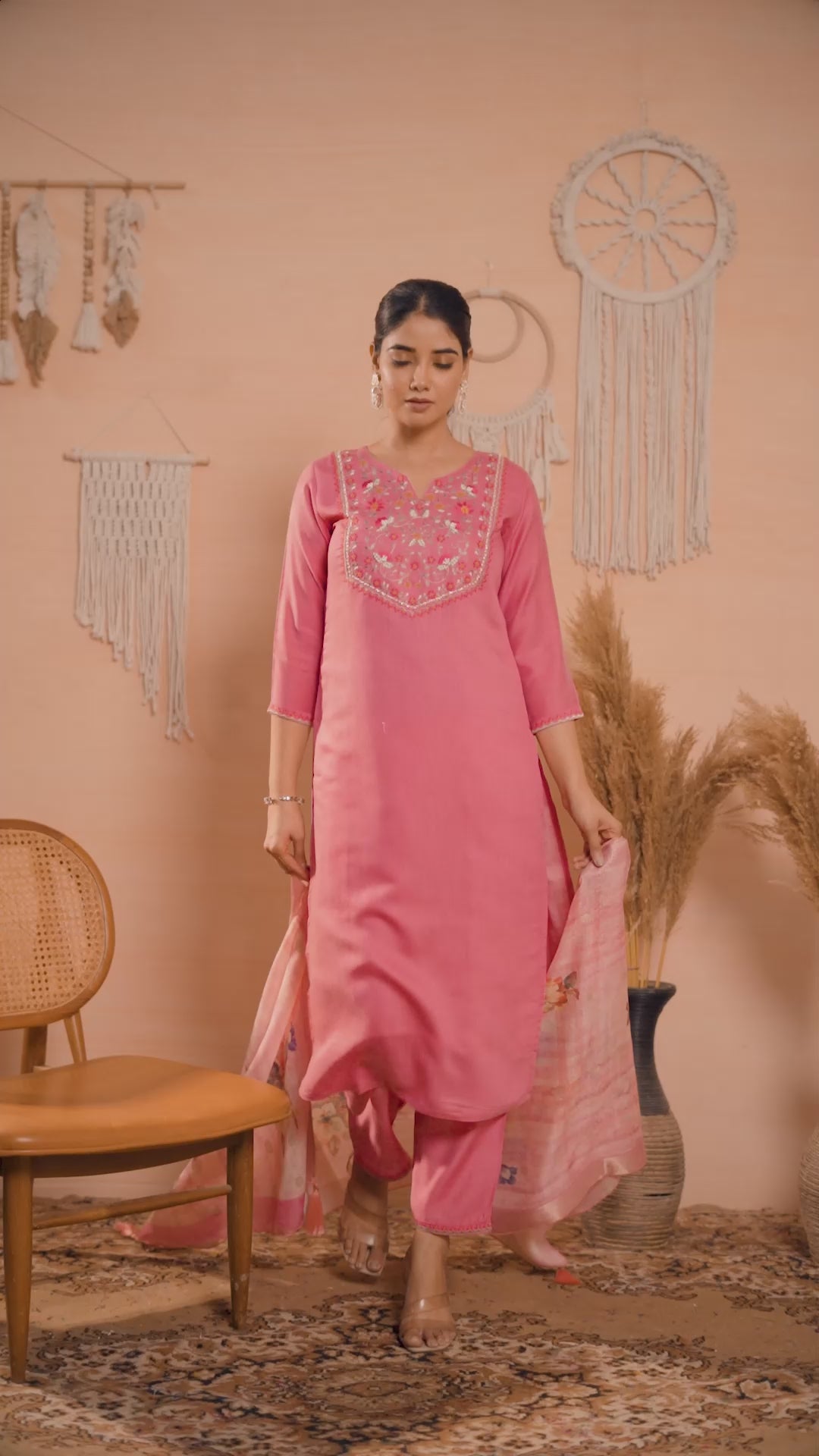 Pink colored suit is prettified with floral embroidered work as shown which makes it appear classy. This top is made of cotton slub fabric which is accompanied with cotton slub bottom and printed muslin jacquard dupatta. Women can buy this suit to wear for their festive and functions.