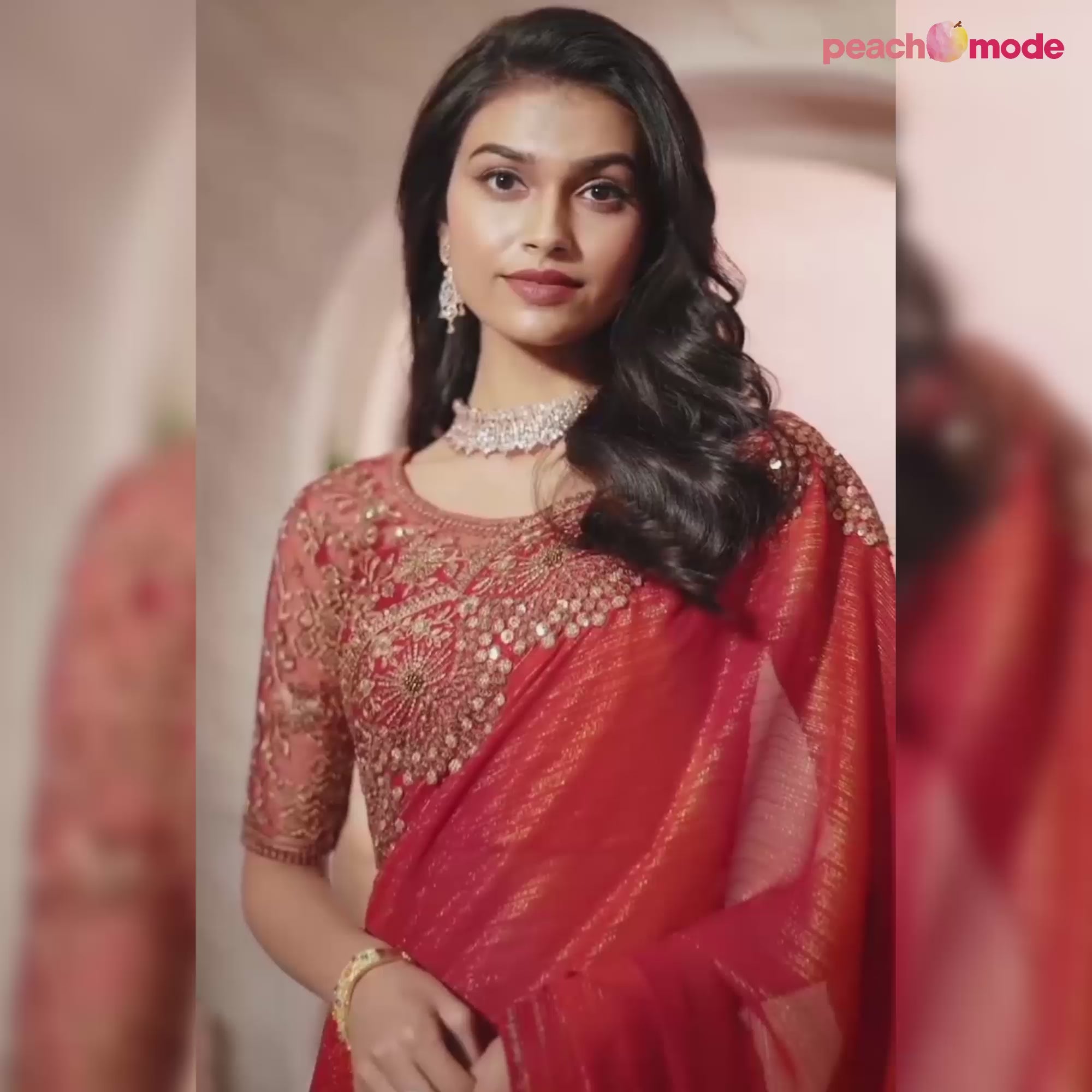 Red & Orange Floral Sequins Embroidered Chiffon Saree