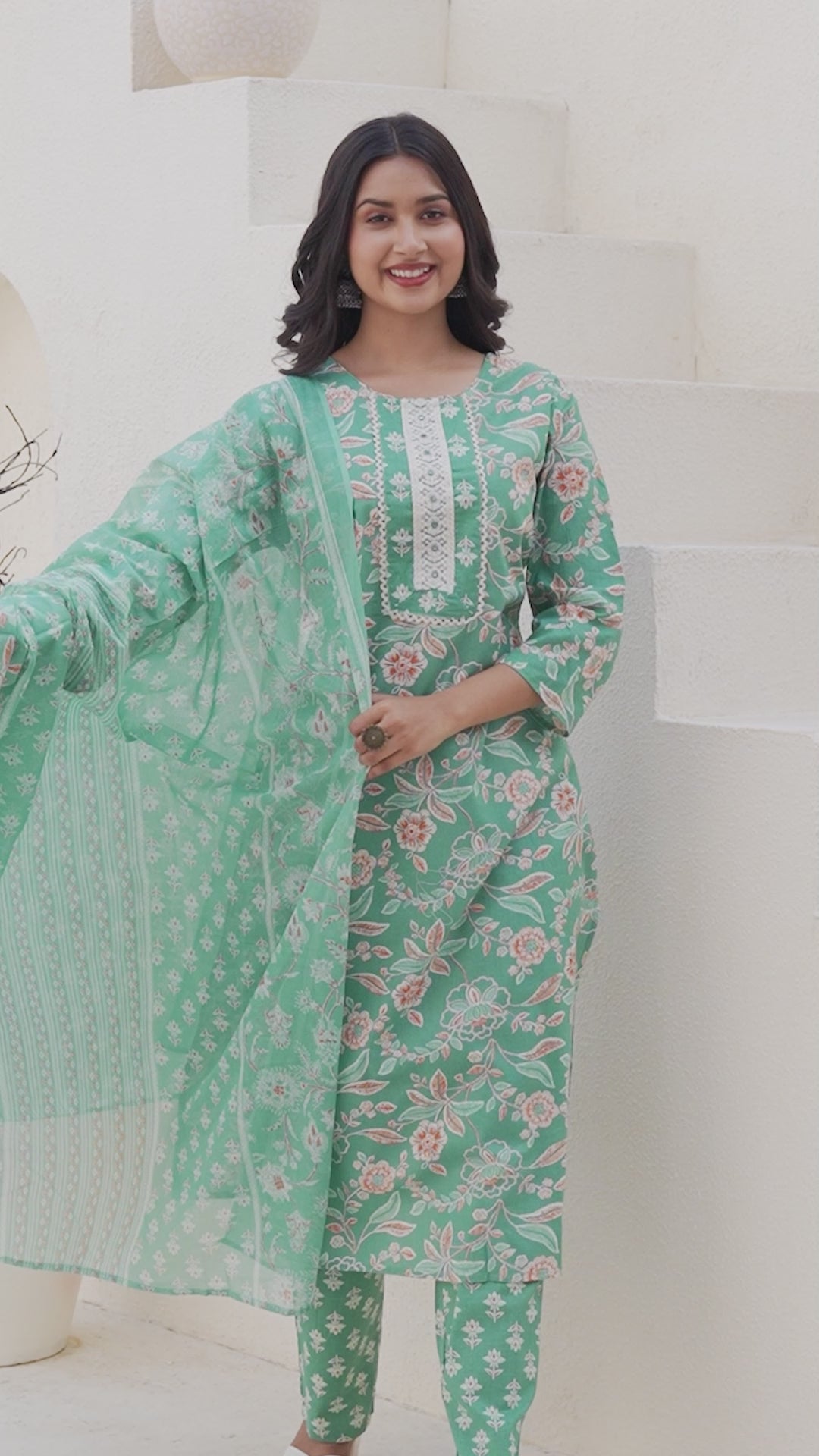 Sea Green Floral Printed With Embroidery Work Cotton Blend Straight Salwar Suit