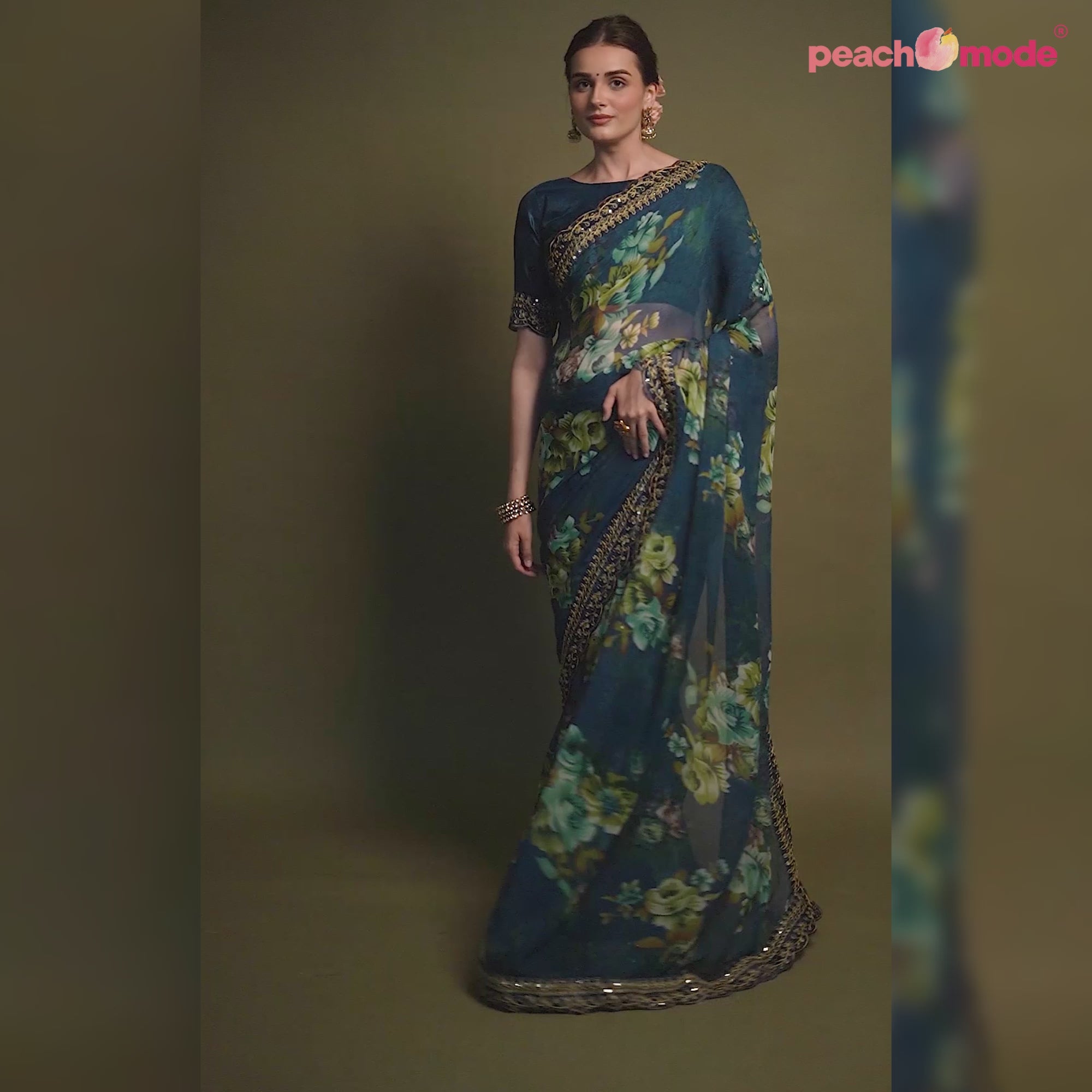 Teal Floral Printed Georgette Saree With Embroidered Border