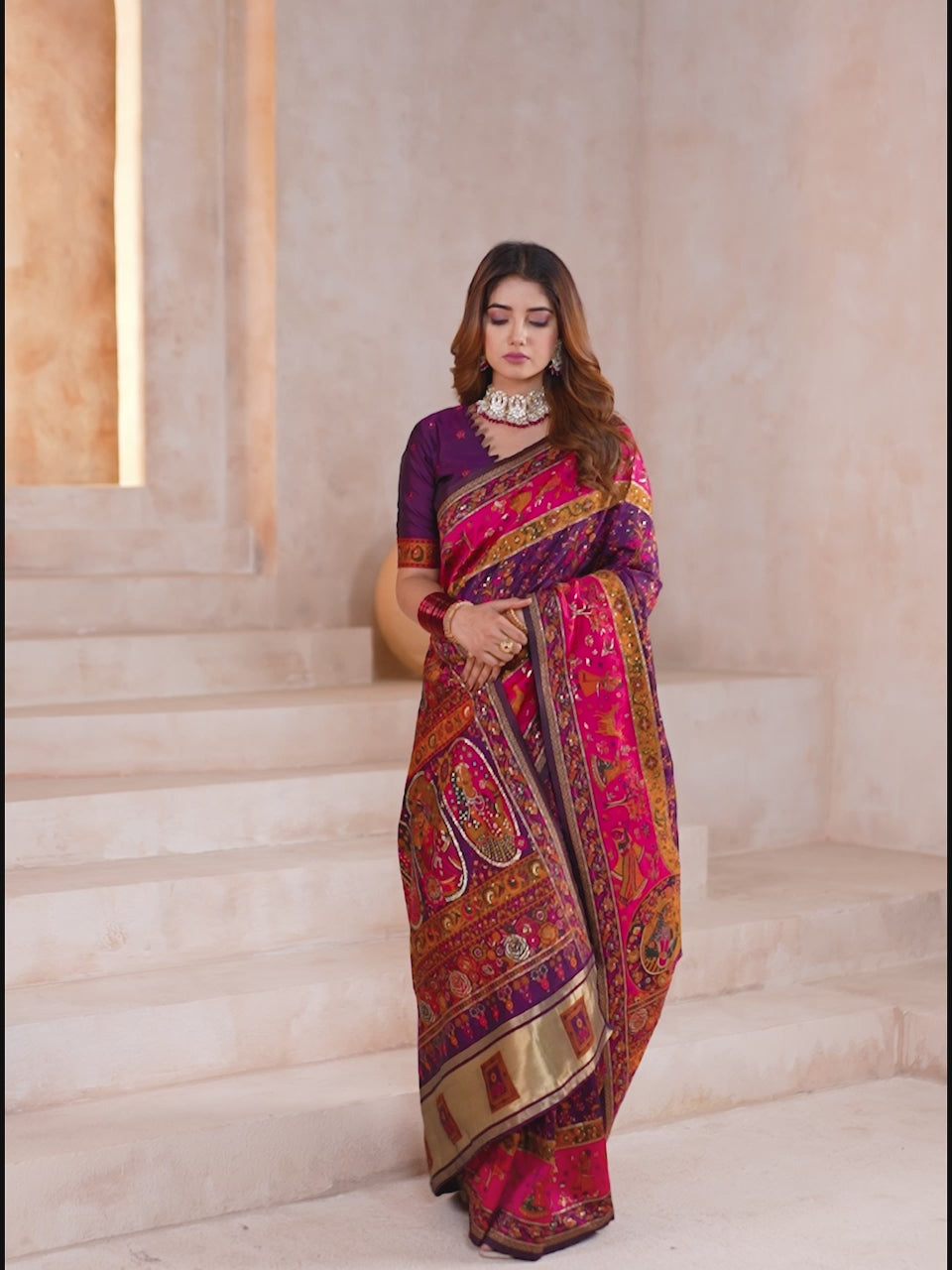 Traditional Wine Rajwadi Weaving Pashmina Silk Saree With Kashmiri Pallu & Elegant Zari Border