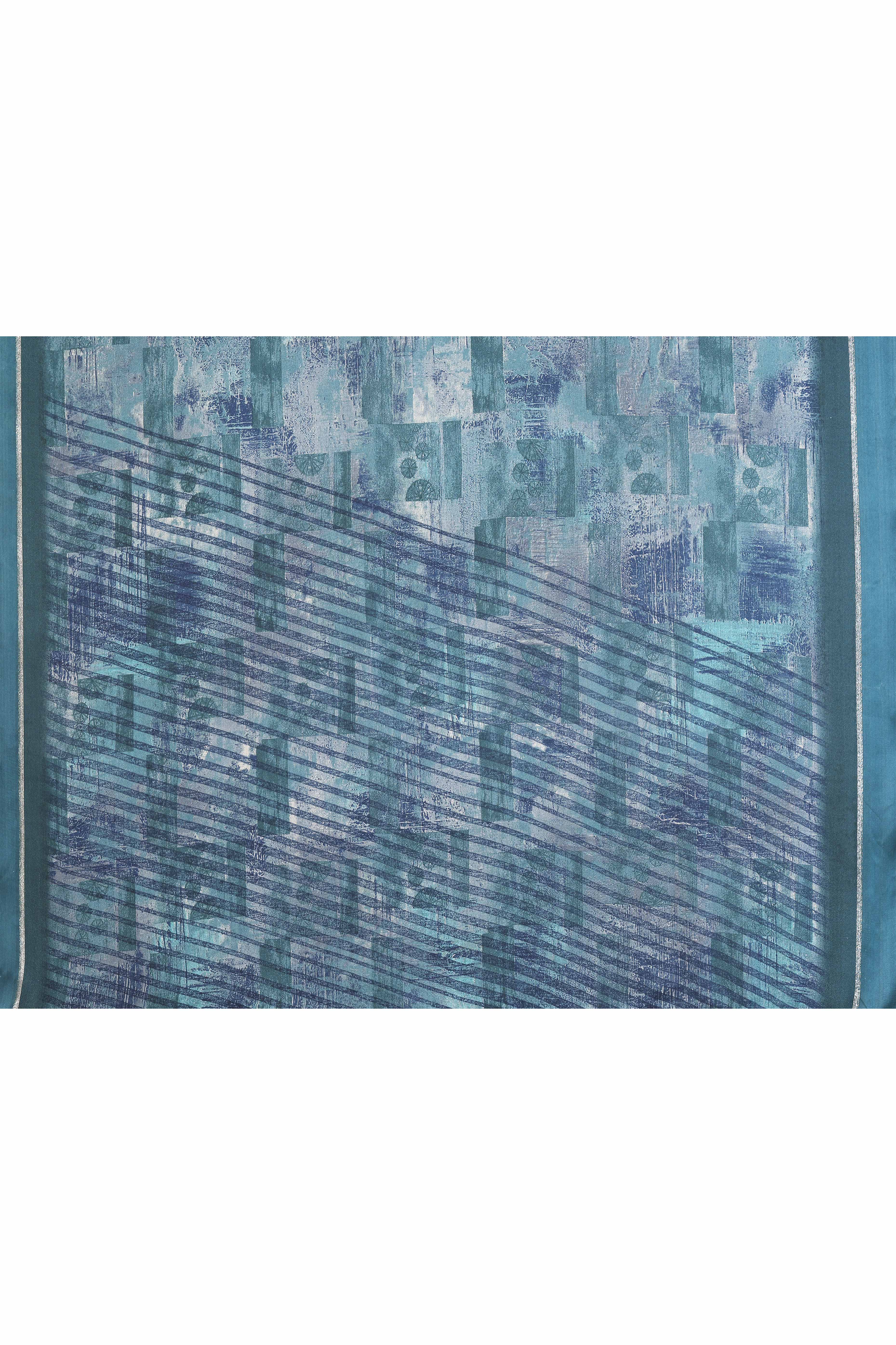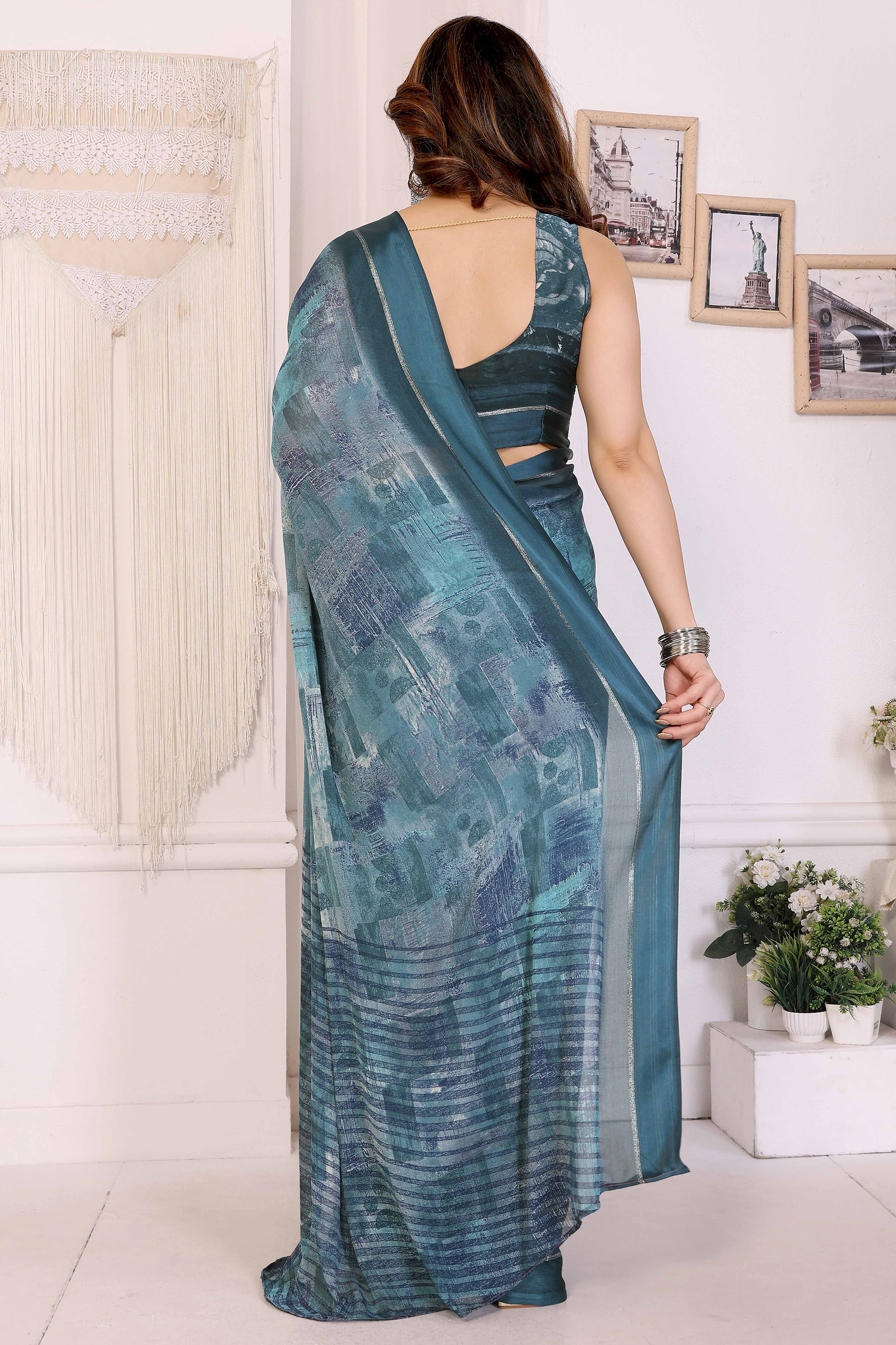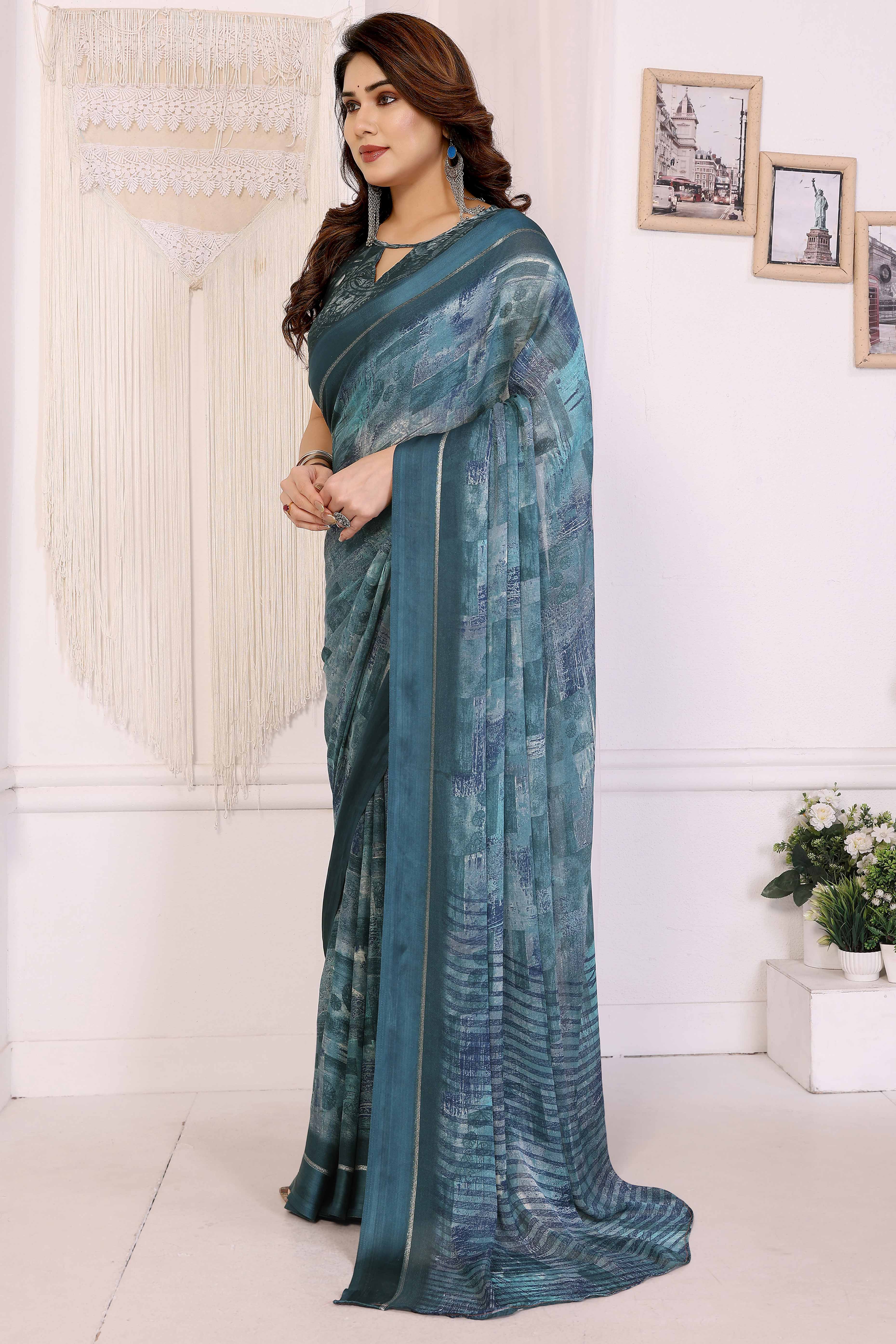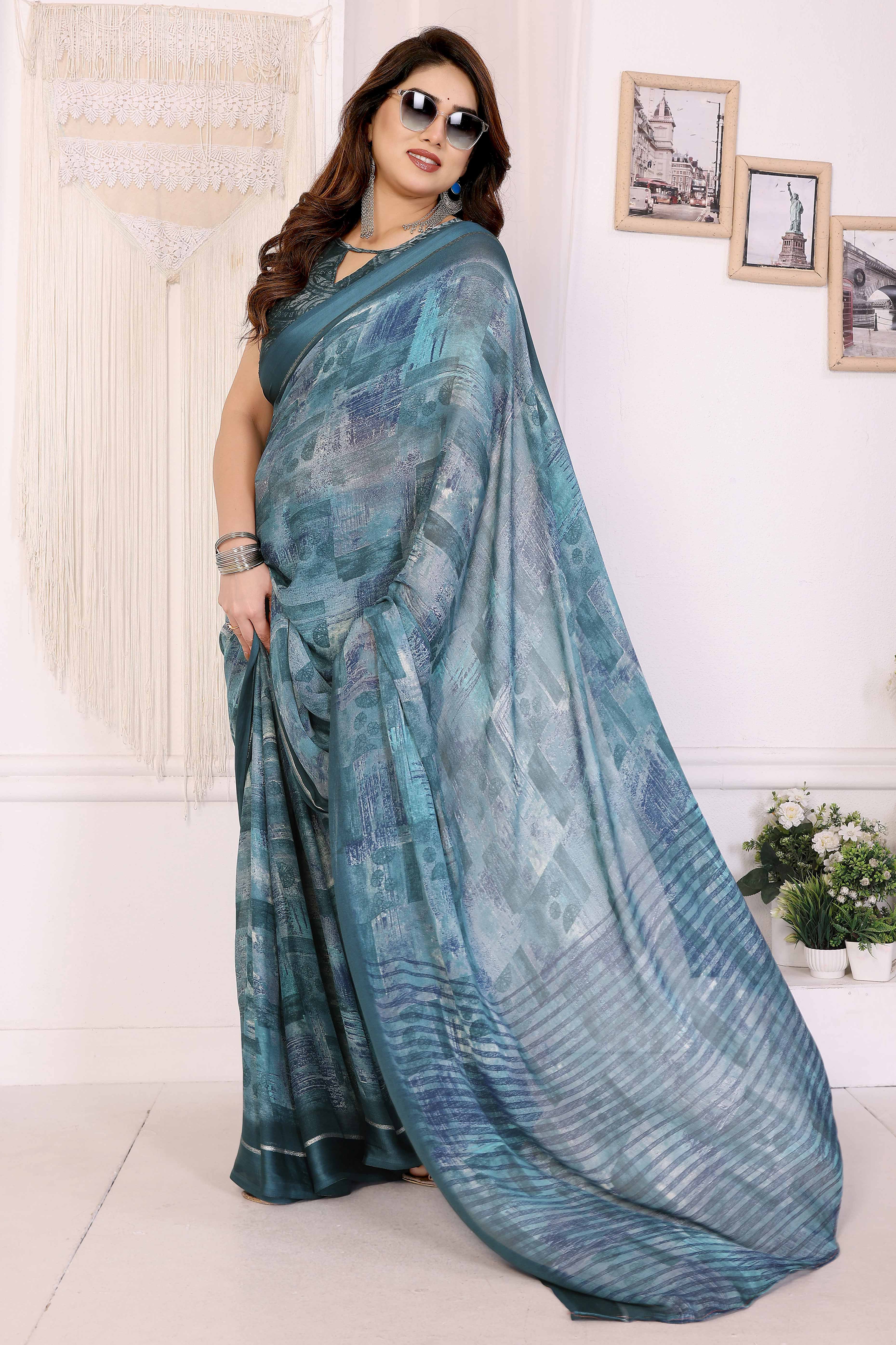Trendy Teal Moss Crepe Saree with Floral Motifs and Satin Border