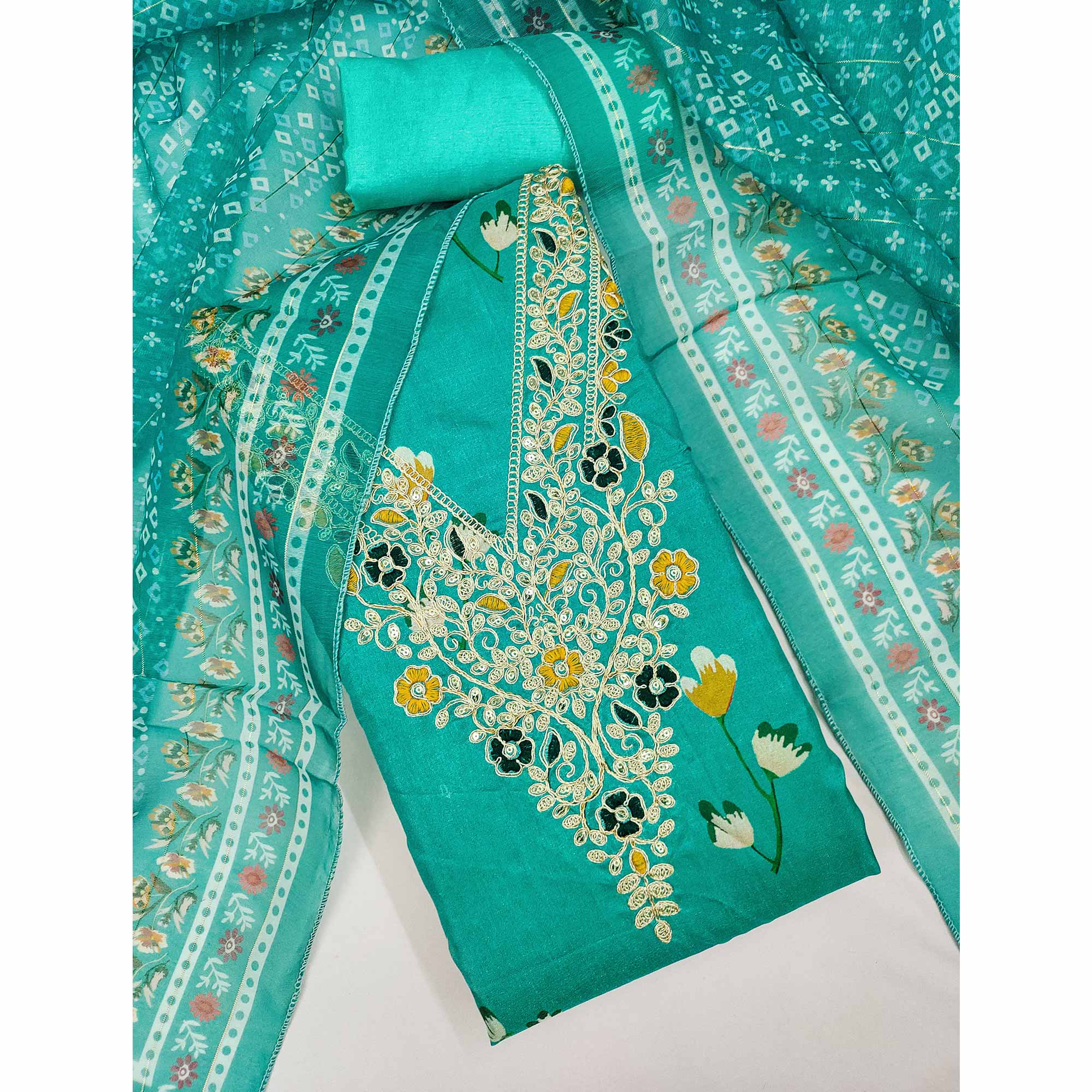 Turquoise Chanderi Silk Dress Material With Floral Digital Print & Delicate Cording Embroidery
