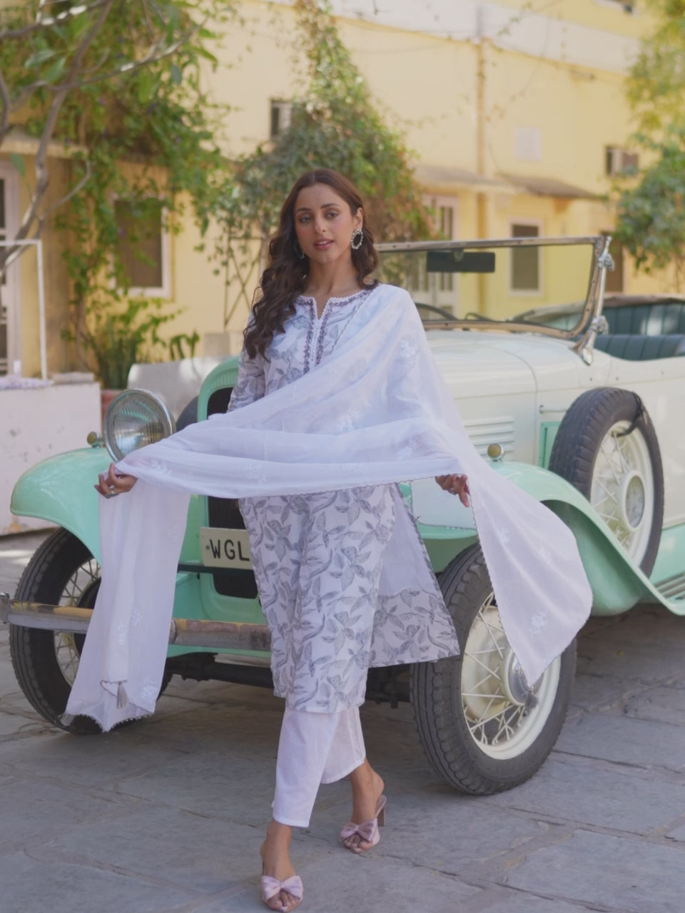 White & Grey Floral Printed Pure Cotton Straight Salwar Suit
