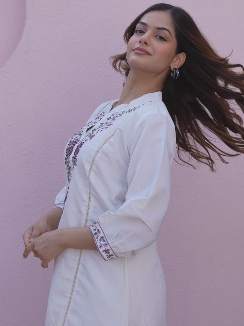 White Viscose Mango Silk A-Line Kurti with Floral Embroidery On Neck